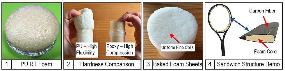 We offer a variety of foaming processing solutions tailored to different application needs. Whether you require room-temperature foaming for rapid forming to save energy and time, or precision baking techniques for optimal performance, we can precisely control the bubble structure to ensure uniform density and stable material integrity. 1. High-Flexibility Polyurethane (PU): Offers excellent shock absorption and rebound, making it the ideal choice for protective gear and cushioning materials (Fig. 1). 2. High-Compression Epoxy Foam: Maintains rigidity and support under high-pressure conditions, perfectly balancing hardness and toughness. These materials can be customized according to your application, eliminating the need to compromise between lightweight and strength (Fig. 2). 3. Baked Foam Core: By precisely controlling heat to activate the foaming agent, it forms a fine and uniform cell structure, serving as the key core for sandwich composite structures. When combined with carbon fiber composites, this foam core can reduce structural weight by 40–60%, achieving extreme lightweight performance. It is commonly used in high-end sports equipment and high-performance structural components (Figs. 3, 4). We welcome you to contact us if you are interested. —Author: Ms. Huifang Lai